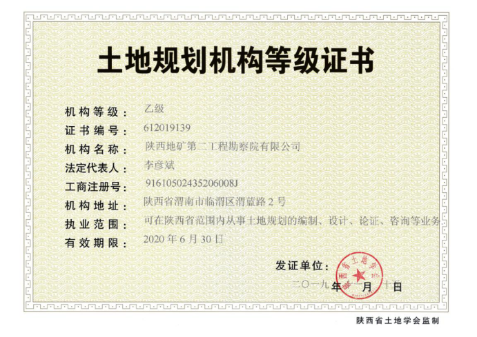根據(jù)《陜西省土地規(guī)劃機(jī)構(gòu)管理實(shí)施辦法》的規(guī)定和要求,在公司相關(guān)部門的支持下,由勘院綜合部具體負(fù)責(zé)申報(bào),我公司于2019年11月15日成功獲得由陜西土地學(xué)會(huì)評(píng)審頒發(fā)的“土地規(guī)劃機(jī)構(gòu)”乙級(jí)資質(zhì)證書。