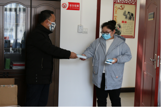 (圖為公司新冠狀肺炎防控領(lǐng)導(dǎo)小組工作人員為復(fù)工員工發(fā)放口罩等防護(hù)用品)