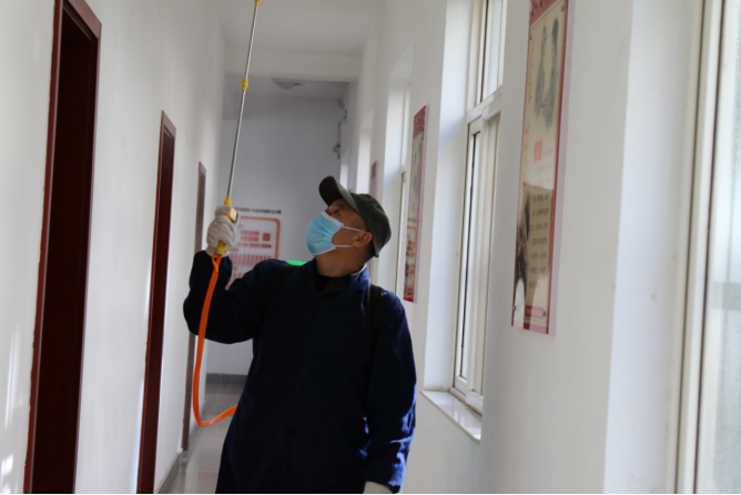 (圖為物業(yè)中心工作人員對辦公樓樓道消毒)