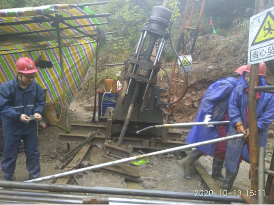 ZK401為桐木溝項(xiàng)目施工的第二個(gè)鉆孔,鉆孔于2020年9月23日開(kāi)始施工,其間克服了地形、連續(xù)雨天等不利因素,國(guó)慶期間持續(xù)鉆進(jìn),于10月13日施工至設(shè)計(jì)深度。10月13日,在綿綿細(xì)雨中,地質(zhì)組與鉆探組在機(jī)場(chǎng)進(jìn)行了測(cè)斜、孔深校正等工作,為鉆孔終孔做好了準(zhǔn)備。