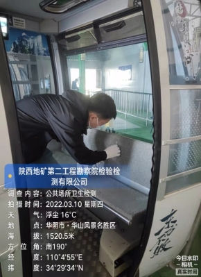 檢驗(yàn)檢測公司于2022年3月9日-10日派周紅利、李尊嚴(yán)、郭磊3位技術(shù)人員前往華山景區(qū),對景區(qū)內(nèi)纜車、游客服務(wù)中心、旅游大巴、旅店等公共場所及公共用品用具進(jìn)行衛(wèi)生監(jiān)測采樣,工作取得順利進(jìn)展。