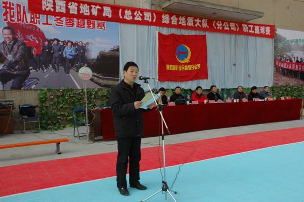 黨委書記武青海致開幕詞,工會主席解北平宣布綜合地質(zhì)大隊(分公司)冬季運動會開幕。吳巡視為籃球賽挑球。