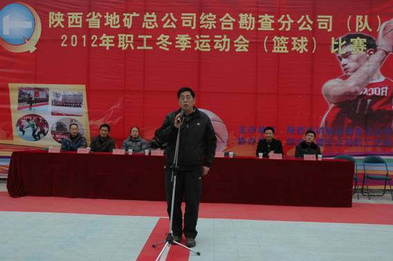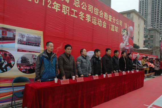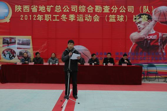 黨委書記武青海致開幕詞,工會主席解北平宣布分公司(綜合地質(zhì)大隊)冬季運(yùn)動會開幕。王建洲為籃球賽挑球。