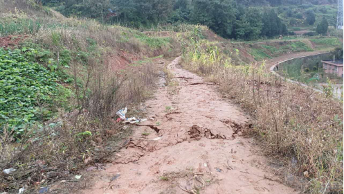 滑坡體前部多處膨脹裂縫錯(cuò)斷道路及排水渠