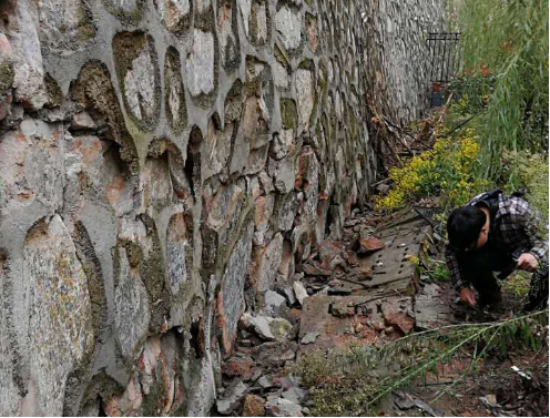 滑坡體前緣擋土墻向前推移近c(diǎn)m,并出現(xiàn)膨脹掉塊