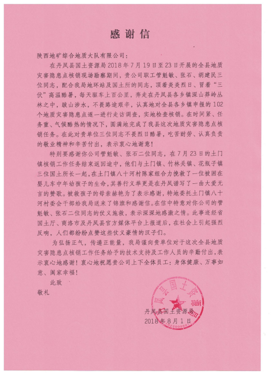 2018年8月1日,一封來自丹鳳縣國(guó)土資源局的感謝信,讓我們又一次地把目光聚焦到管魁敏、張石、胡建民三名地質(zhì)工作者,他們愛崗敬業(yè)、吃苦耐勞、對(duì)黨的地質(zhì)事業(yè)忠誠(chéng),他們是地質(zhì)工作者“三光榮”“四特別”的真實(shí)寫照。他們見義勇為、救危扶困,更是社會(huì)主義核心價(jià)值觀的踐行者,他們將地質(zhì)工作者的職業(yè)素養(yǎng)延伸到生活中,明大德,講公德,守私德,他們?yōu)榈刭|(zhì)工作者贏得了社會(huì)尊重,向他們致敬,向廣大地質(zhì)工作者致敬!